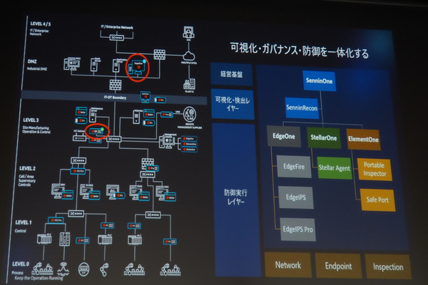 OT向けのソリューションとしては、エアギャップ環境の端末や持ち込み機器の検査を効率化する「Elementシリーズ」から、アンチウィルスやロックダウン、ふるまい検知などを備えたエンドポイント保護の「Stellarシリーズ」、そして、OTネットワークの監視・防御のための「Edgeシリーズ」まで幅広く展開する。そして、これらソリューションを含むOTセキュリティの統合管理は「SenninOne(旧SageOne)」プラットフォームが担う。
