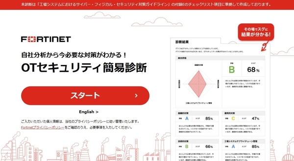 また、前回紹介した経産省の「工場システムにおけるサイバー・フィジカル・セキュリティ対策ガイドライン」に基づくコンサルティングもパートナー企業と共に提供する。工場のセキュリティ対策のレベルを最短15分で判定するWeb診断も無償公開中だ。