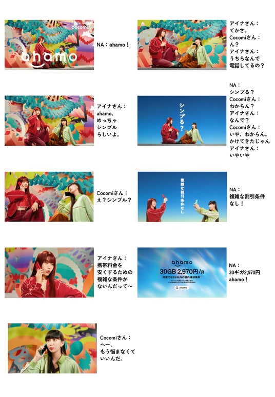 ahamoは、複雑な割引条件がない、シンプルで分かりやすい料金体系を提供することで、ユーザーが安心して利用できるサービスを目指しています。今回の新TVCM“「シンプる?アイナ×Cocomi」篇“は、"シンプルさ"をテーマに、複雑な条件に振り回されることなく、自分らしく生きることの大切さを伝えるために制作されました。今回のオリジナルCMソング「ahamo ahamo ソング」にあわせたキャッチーなダンスを通じて、ahamoのシンプルで明快なサービスの世界観を表現しています。また、新CMの他、メイキング映像やインタビュー映像も併せて公開します。