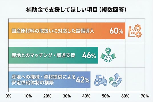 「産地とのマッチング・調達支援」(46%)、「産地への支援を通じた安定供給体制」(42%)など、産地連携に関する支援ニーズが高いことがわかりました。