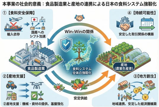 食品製造業と産地が「Win-Win」の関係を築くことで、日本の食料システム全体の強靱化を目指す政策です。