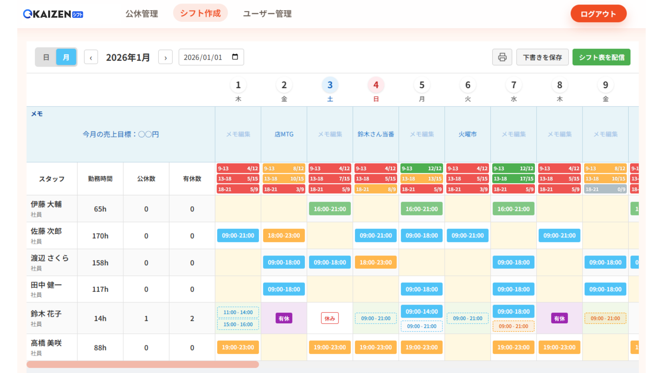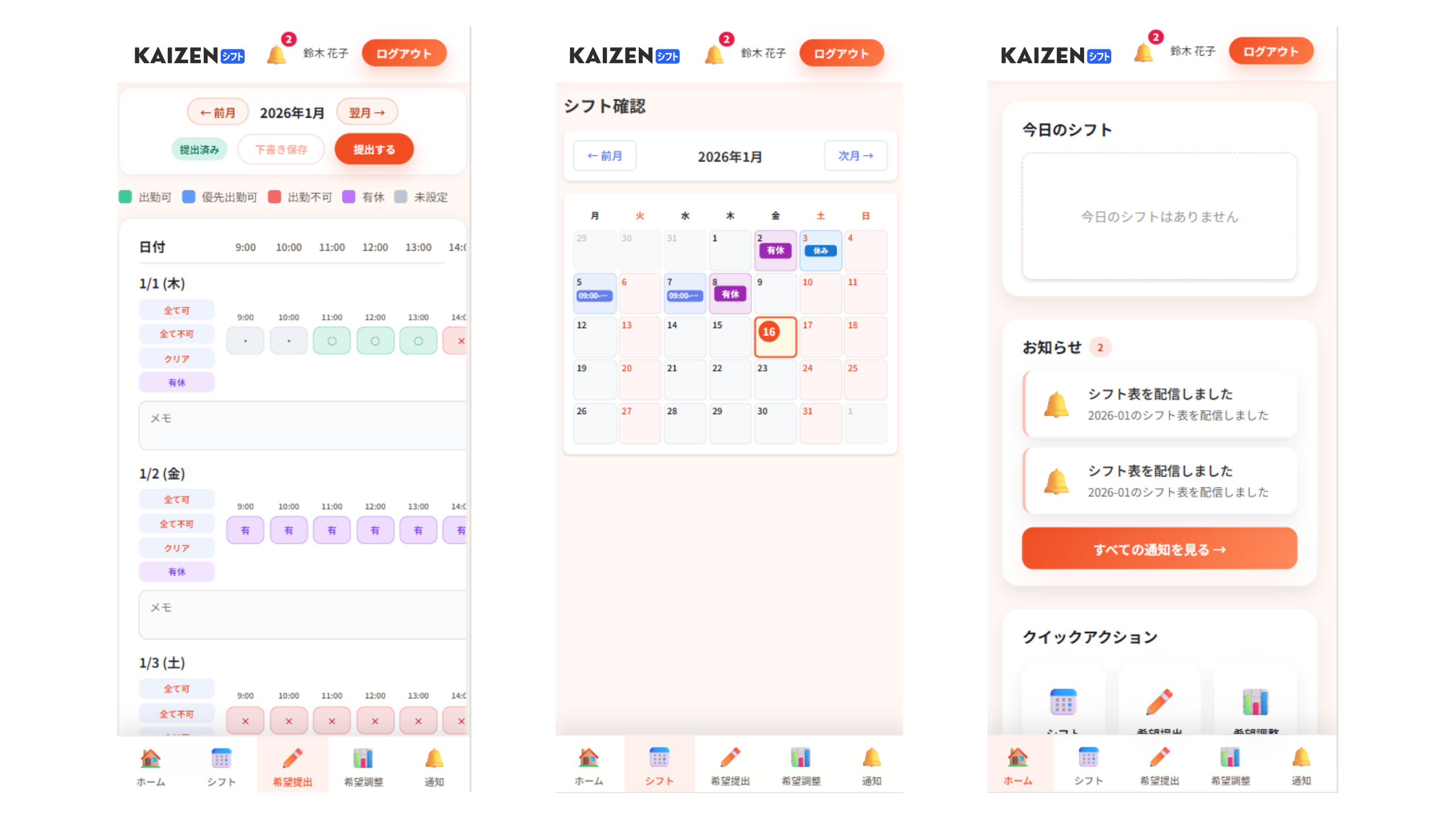 KAIZENシフトは、シフトの希望収集から作成・共有までを一気通貫でデジタル化するクラウド型シフト管理ツールです。PC・スマートフォンのブラウザから利用でき、専用アプリのインストールは不要です。