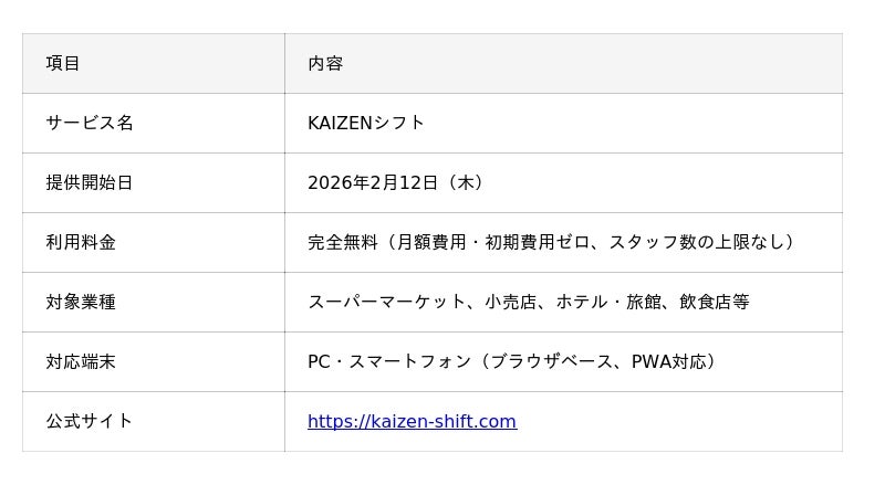 株式会社Mond(本社:島根県松江市、代表取締役:板垣翔大、以下「当社」)は、2026年2月12日(木)より、リアル店舗向け完全無料シフト管理ツール「KAIZENシフト」の提供を開始いたします。本サービスは、スーパーマーケットをはじめとする小売・飲食・宿泊業の店舗において、紙やExcelで行われているシフト管理業務をデジタル化し、シフト作成にかかる時間を最大80%削減※するものです。月額費用・初期費用は一切不要、スタッフ数の上限もなく、すべての機能を完全無料でご利用いただけます。※ 当社ヒアリングに基づく試算値であり、効果は店舗の規模や運用状況により異なります。