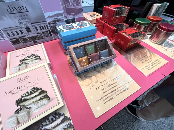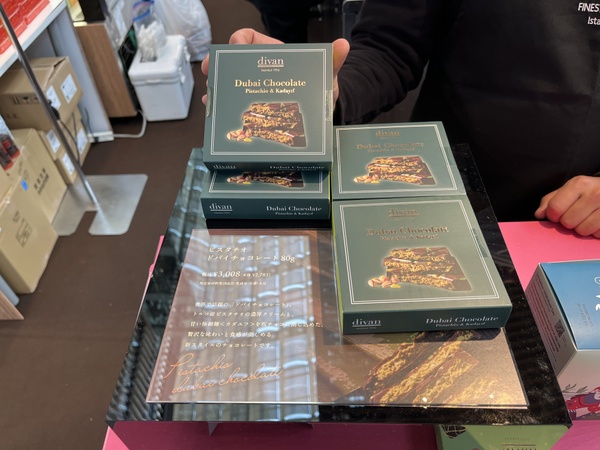 やはりチョコレートも押さえておきたいな…と思って「divan」に立ち寄り。こちらも今回初出店で、松屋銀座などに店舗があります。トルコ・イスタンブールの5つ星ホテル「ディヴァンホテル」発のスイーツブランドで、近年話題の「ドバイチョコレート」を販売していました。