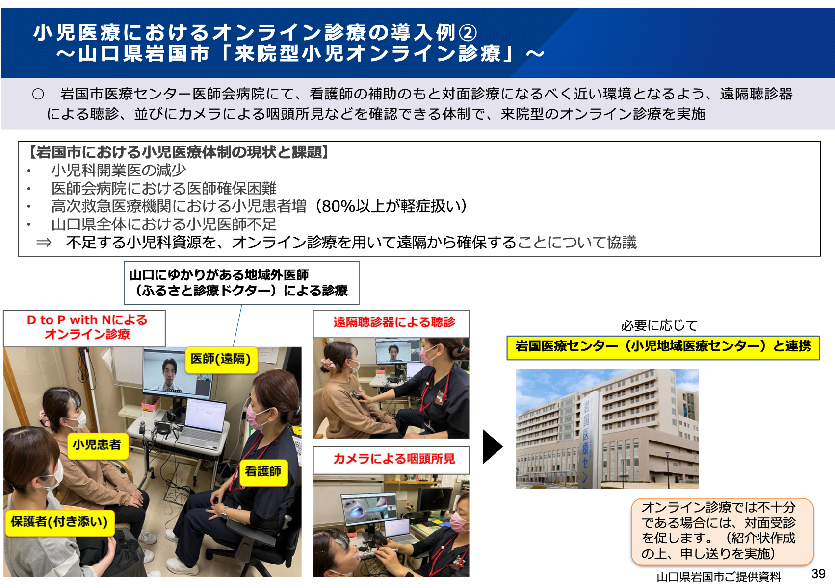 今回のワーキンググループでは、小児医療提供体制の維持が困難な地域における有効な施策として、当社が支援する山口県岩国市の「来院型小児オンライン診療」が取り上げられました 。 岩国市をはじめ多くの地方自治体が抱える「小児科医の減少」や「高次救急医療機関における軽症小児患者の増加」といった課題に対し、オンライン診療を活用して遠隔から小児科リソースを確保する仕組みを構築し、地域の医療提供体制を補完しています。