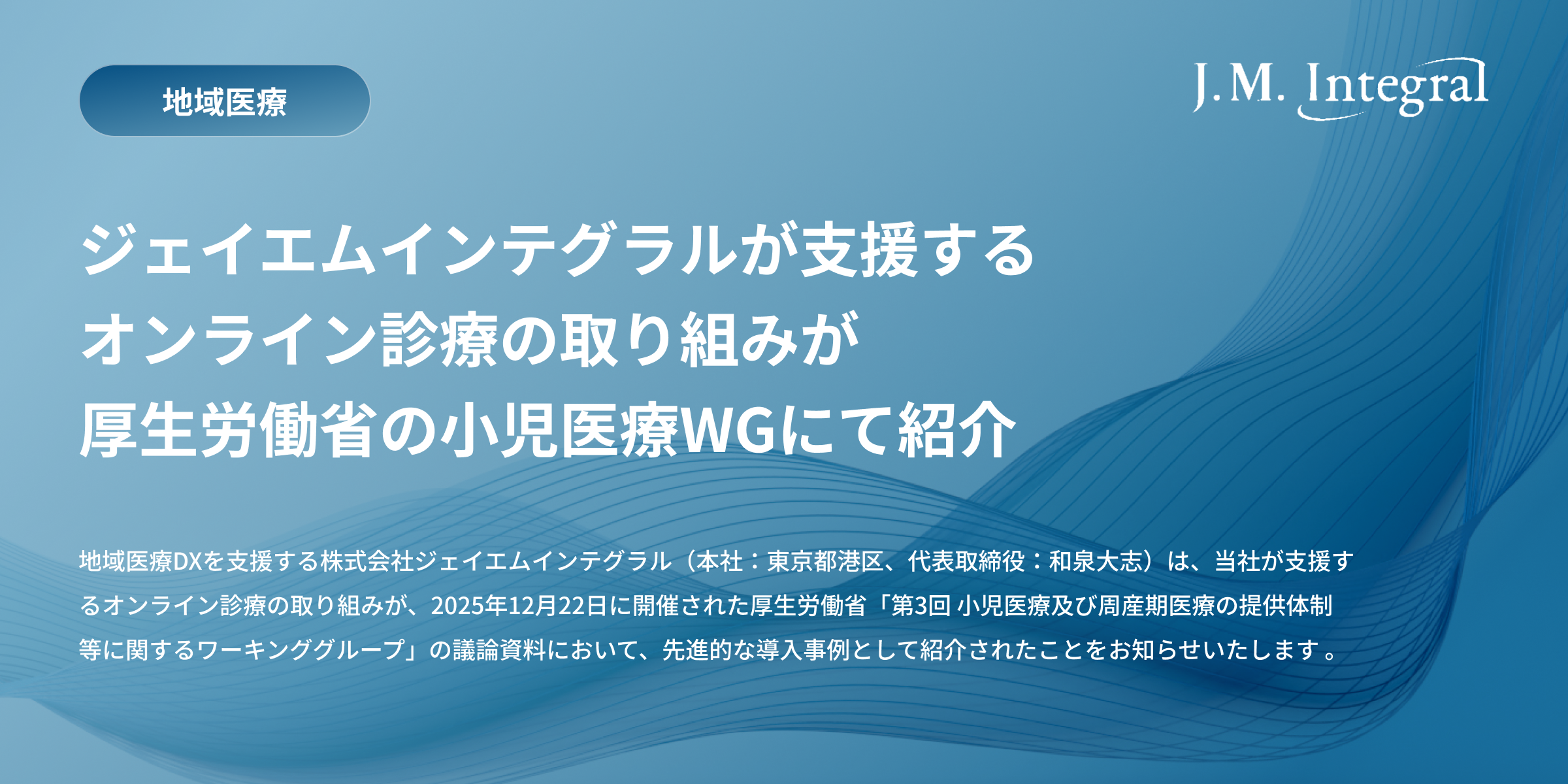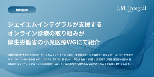 地域医療DXを支援する株式会社ジェイエムインテグラル(本社:東京都港区、代表取締役:和泉大志)は、当社が支援するオンライン診療の取り組みが、2025年12月22日に開催された厚生労働省「第3回 小児医療及び周産期医療の提供体制等に関するワーキンググループ」の議論資料において、先進的な導入事例として紹介されたことをお知らせいたします 。本事例は、小児科医不足や救急医療の負担増といった地域課題に対し、デジタル技術と看護師の補助を組み合わせた「来院型オンライン診療」によって解決を図るもので、先行事例として評価されています。