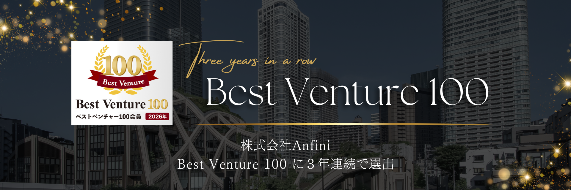戦略コンサルティングを主軸に、教育、AI、メディア、プラットフォーム事業など多角的な事業展開を行う株式会社Anfini(本社:東京都港区、代表取締役:橋本 純)は、成長が期待されるベンチャー企業を選ぶ「ベストベンチャー100」に3年連続で選出されたことをお知らせいたします。