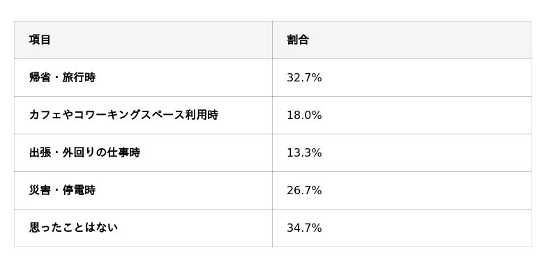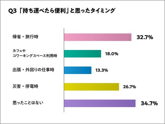 最も多かったのは「帰省・旅行時」(32.7%)で、次いで「災害・停電時」(26.7%)、「カフェやコワーキングスペース利用時」(18.0%)と続きました。