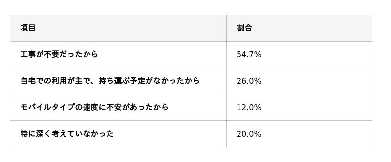 今回の調査では、自宅回線にホームルータータイプを選んだ理由として、「工事が不要だったから」が54.7%と最も多い結果となりました。