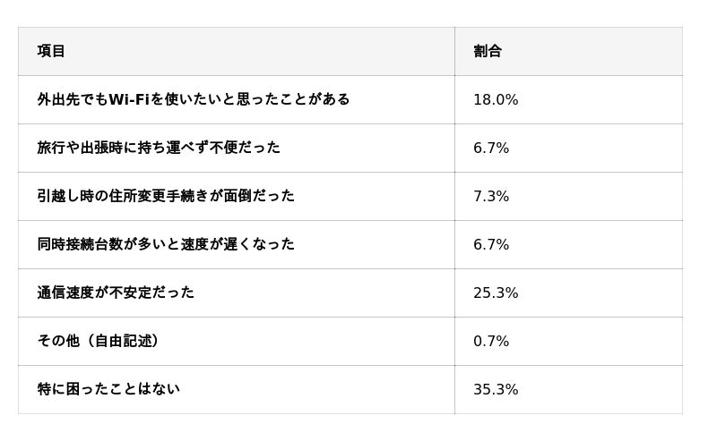 実際、「外出先でもWiFiを使いたいと思ったことがある」(18.0%)、「旅行や出張時に持ち運べず不便だった」(6.7%)、「引っ越し時の住所変更手続きが面倒だった」(7.3%)といった結果が見られます。