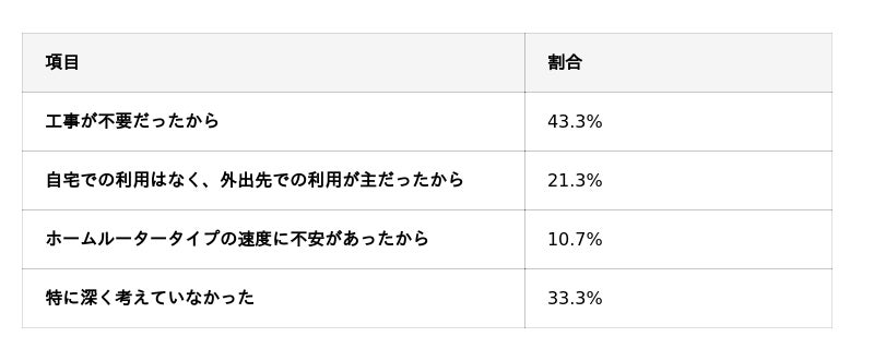 モバイルルータータイプを選択した理由として最も多かったのは、「工事が不要だったから」(43.3%)でした。この結果は、前項のホームルーター選択理由と同様に、端末選びにおいて“初期の手間を避けたい”という意識が強いことを示しています。