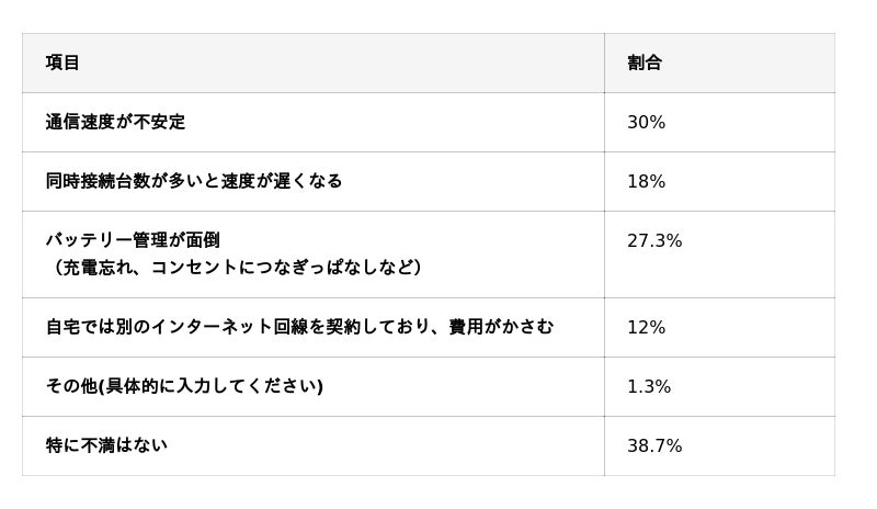 不満として最も多かったのは「通信速度が不安定」(30.0%)で、次いで「バッテリー管理が面倒」(27.3%)「同時接続台数が多いと速度が遅くなる」(18.0%)と続いています。