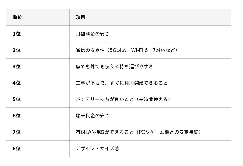 また、「家でも外でも使えること」や「工事不要ですぐに使えること」が上位に挙がっている点からは、利用シーンを限定せず、生活の変化に柔軟に対応できるネット環境を求める意識もうかがえます。