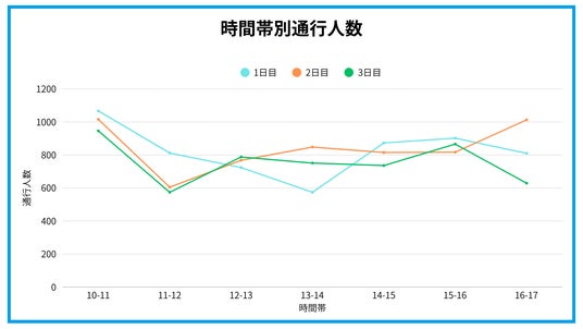 - 通行傾向の分析・開場直後の10時台が最大のピーク3日間共通して開場直後の10時台が最も通行人数が多い結果となりました。