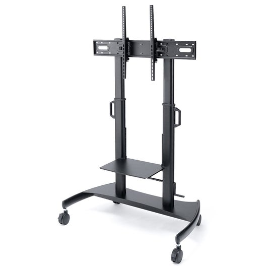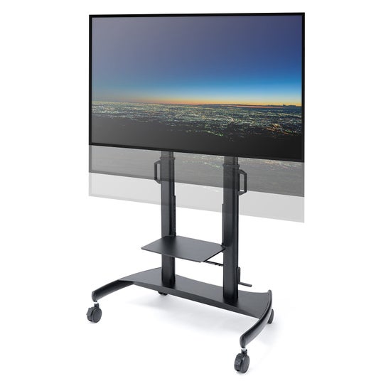 直径100mmの大型キャスターを採用し、4輪すべてに車輪・車軸ロックを搭載。重量のあるディスプレイを載せた状態でもスムーズに移動でき、設置後はしっかり固定できます。会議室間の移動や展示会でのレイアウト変更など、頻繁な移動が発生する現場でも高い安定性を発揮します。