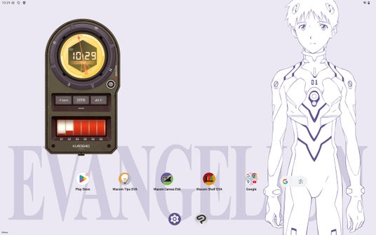 「Wacom MovinkPad Pro EVA Edition」では、デバイスの表示や操作画面にも特別なデザインや機能を多数取り入れています。スケッチアプリ「Wacom Canvas」では、メニューアイコンをハニカム(六角形)デザインに変更。作品画像を保存・管理できる「Wacom Shelf」でも、ハニカムデザインを用いた一覧表示を採用しています。さらに、時計とコンパス機能を備えたウィジェットアプリ「Wacom CClock EVA」も搭載。デザインは、劇中に登場するデバイスをモチーフにしています。