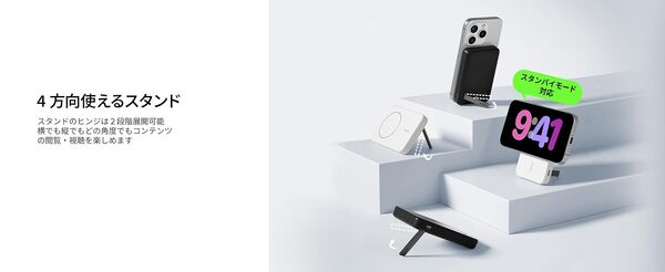 モバイルバッテリー本体にキックスタンドが付いているので、「充電できるスマホスタンド」としても使えるところが心憎いですね。