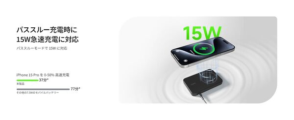 Qi2規格に対応したワイヤレスモバイルバッテリーで、対応するiPhoneなどにマグネットでピタッと吸着し、そのままワイヤレス充電が可能。ケーブルを挿す手間がなく、位置ズレによる充電効率の低下を抑えながら、最大15Wの高速ワイヤレス充電を実現しています。