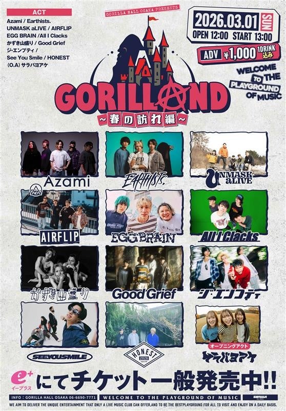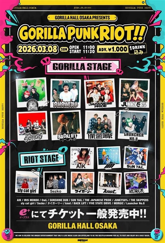 大阪・GORILLA HALL OSAKAは、2026年3月1日(日)に『GORILLAND ~春の訪れ編~』、3月8日(日)に『GORILLA PUNK RIOT!!』と題した自主企画イベントを、会場として初となる2週連続で開催する。本企画は、近年さまざまな議論が交わされているライブハウスの来場システムや1DRINK制について、実際の運営を通して検証するテストケースとして実施される。