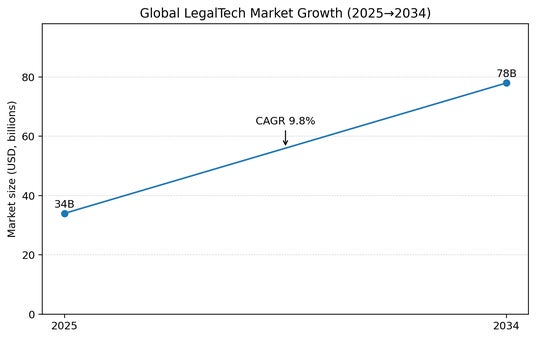 グローバルリーガルテック市場は2025年に約340億ドル(約5兆円)規模であり、2034年には約780億ドルに成長すると予測されています(CAGR約9.8%)。
