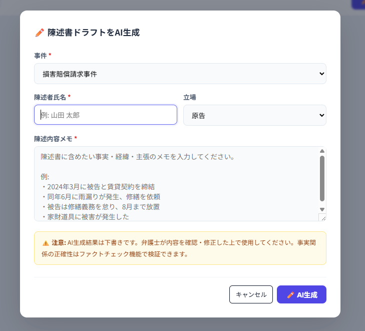 原告・被告・証人・関係者の4立場に対応した陳述書ドラフトをAIが自動生成。事件コンテキストの自動注入とファクトチェック統合(ワンクリック実行)により、正確性の高い下書きを効率的に作成します。