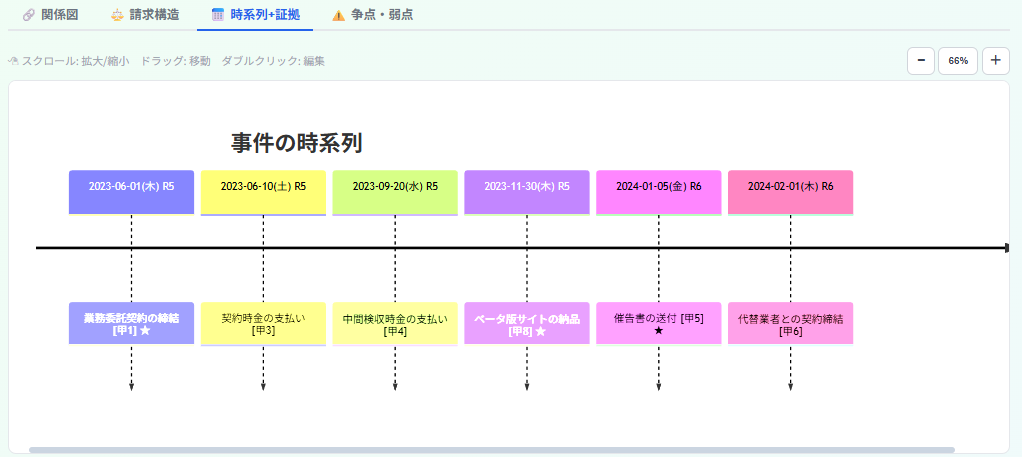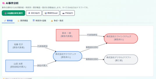事件情報をAIが構造化分析し、関係者関係図・請求構造・時系列経緯図・争点弱点の4タブで表示。