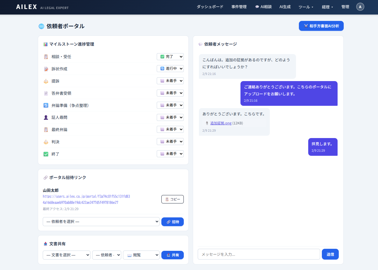 マイルストーン進捗管理(ステータス・期日・完了率表示)、文書共有(弁護士が選択した文書のみ公開)、メッセージ送受信(ファイル添付対応)により、依頼者とのコミュニケーションを円滑化します。
