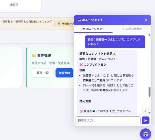 - コンフリクトチェック(事件登録時自動照合+全事件スキャン+ダッシュボードアラート)