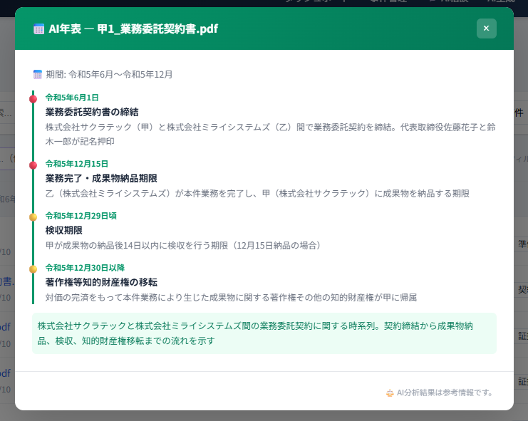 文書一覧から📋要約・ 年表・?QAの3種類のAI分析をボタン1つで実行。