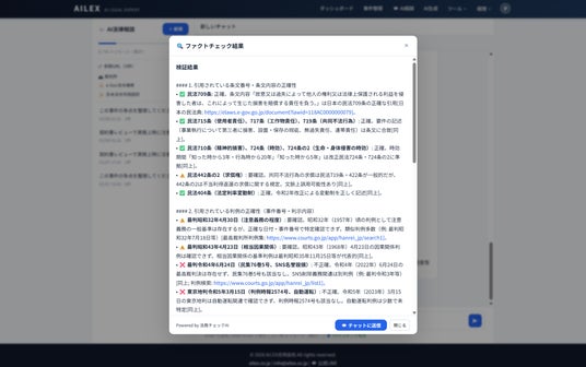 Perplexity APIと連携し、AI生成文書や相手方書面の法的根拠・判例引用をリアルタイムで検証します。