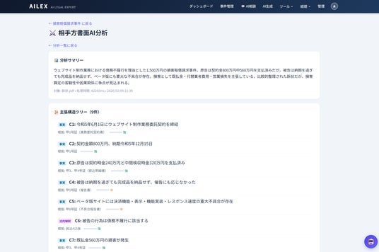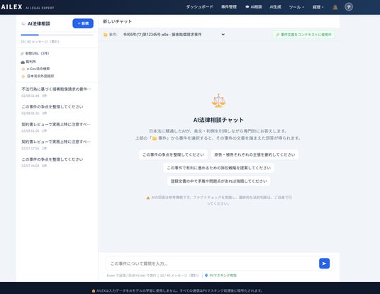 ※ AILEXが生成する全てのAI出力は「ドラフト・参考情報」であり、最終的な法的判断は弁護士自身が行うことを前提としています。本サービスは弁護士法72条に定める法律事務の取扱いには該当しない、弁護士の業務支援ツールです。