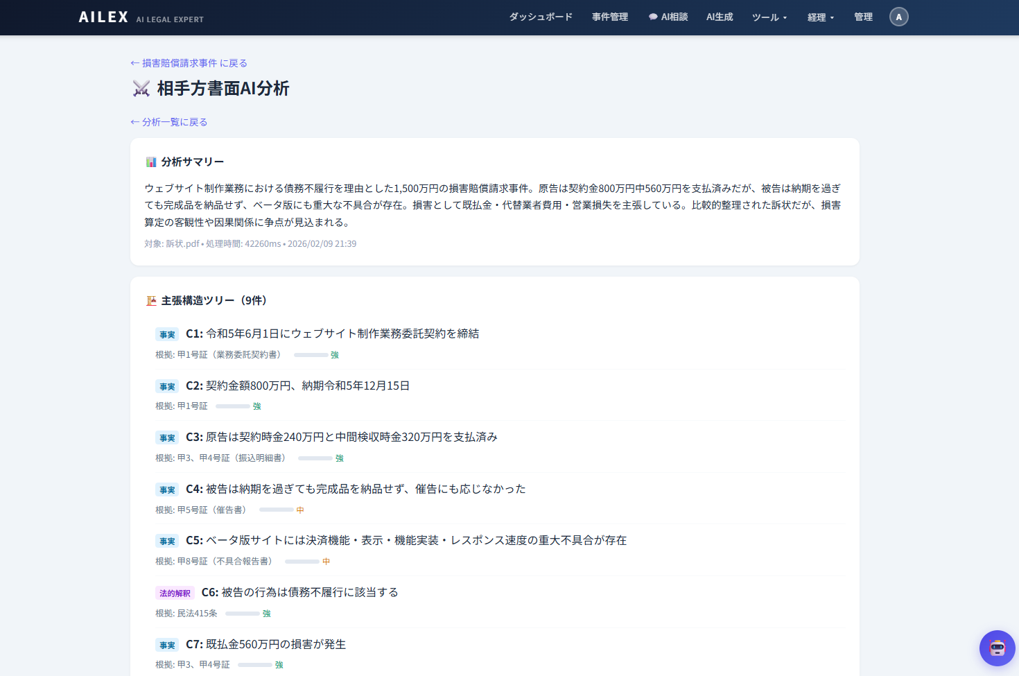 事件内の全文書を横断的にAI分析し、事案の全体像、矛盾・相違点の検出(影響度+対応案付き)、証拠の空白・欠落、統合年表、分析視点の提案、要注意ポイント(相手方に突かれる可能性のある弱点)の6セクションを自動生成。