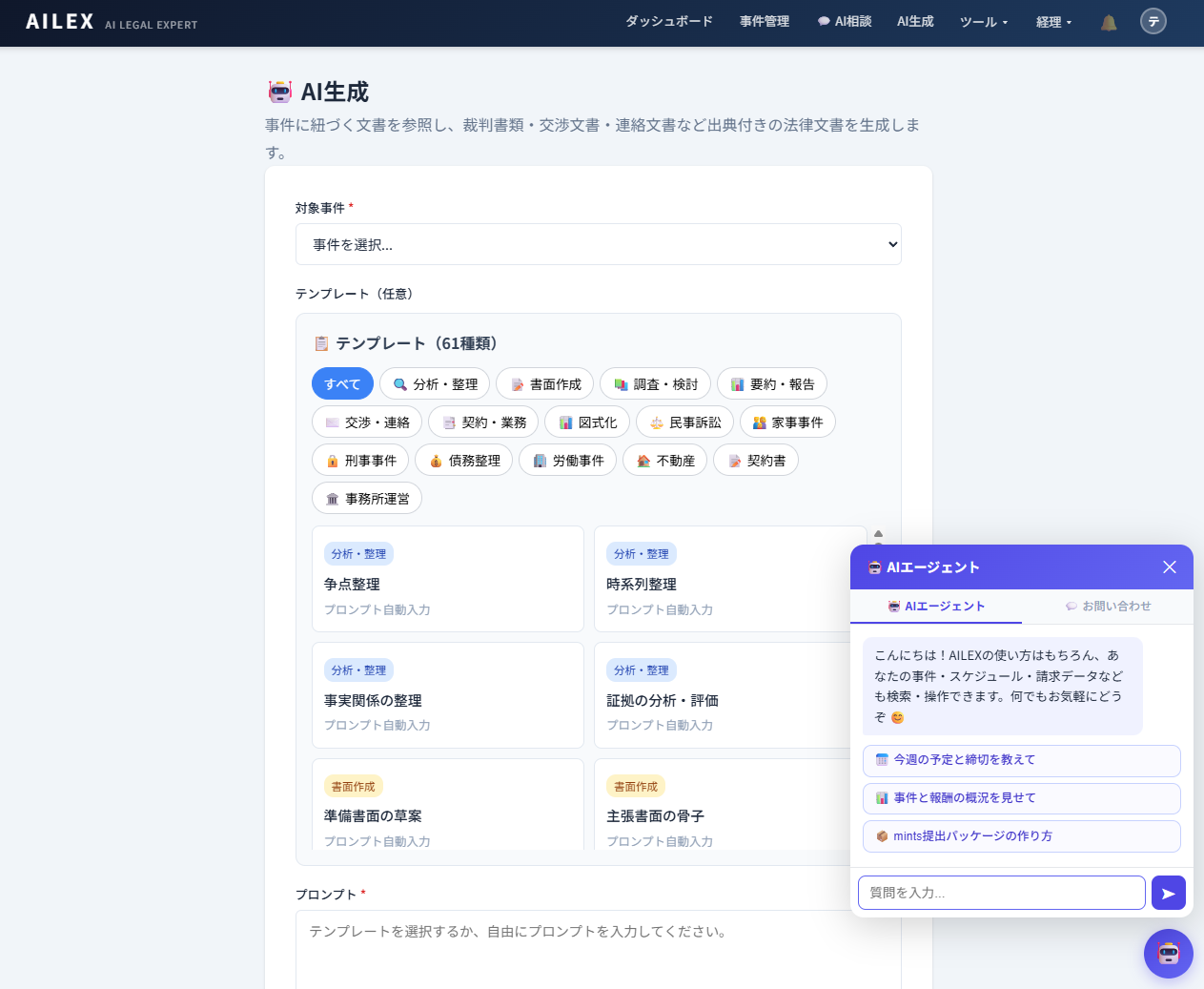 訴訟・交渉・契約の各場面に対応する58種類のAIテンプレートを搭載。