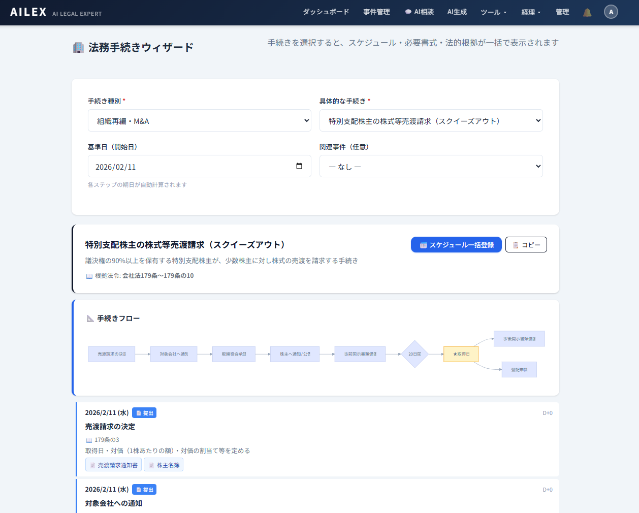 手続き種別と基準日を選択するだけで、全体フロー・各ステップの期日・必要書式・法的根拠・実務上の注意事項を自動生成。スクイーズアウト(2種)・吸収合併・事業譲渡・株主総会・第三者割当増資・減資・取締役選任退任・解散清算・本店移転の6カテゴリ10手続きに対応。