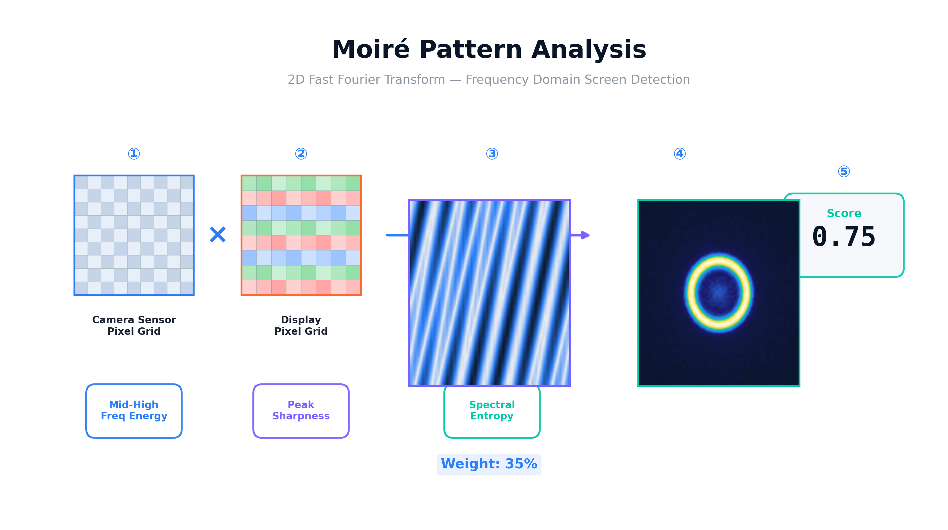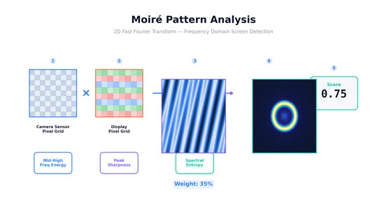 ディスプレイのピクセルグリッドとカメラセンサーの干渉により生じるモアレ縞を、2次元FFT(高速フーリエ変換)により検出します。Garcia & de Queiroz(IEEE TIFS, 2015)の手法に基づき、中高周波帯域のエネルギー比率・ピーク鋭度・スペクトルエントロピーからスコアを算出します。