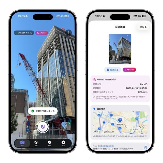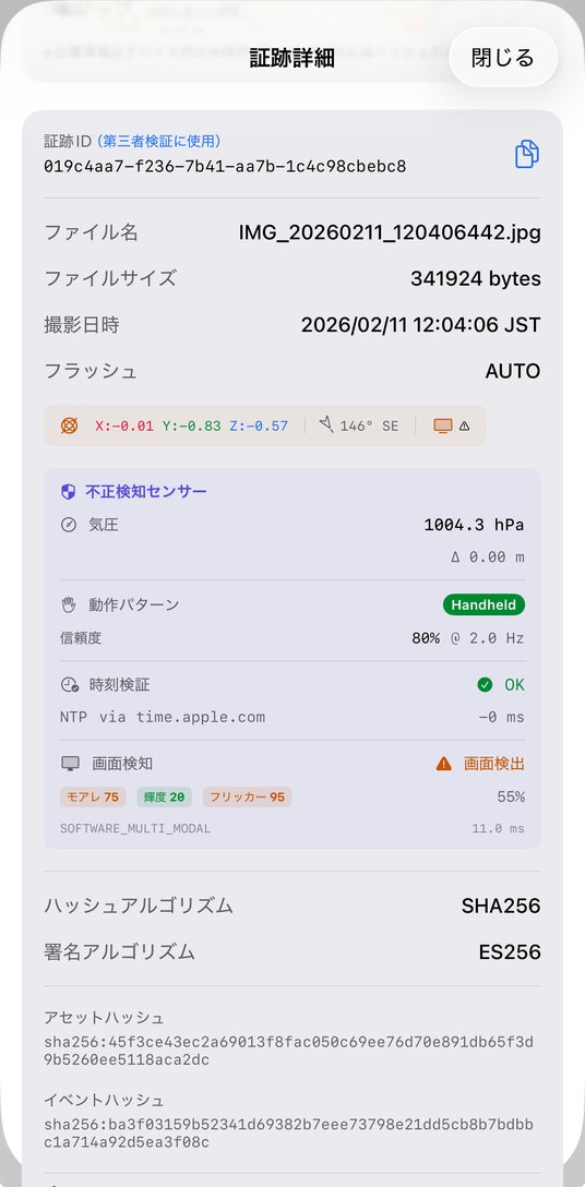 ※1 「世界初」は、消費者向けスマートフォンアプリにおいて、気圧センサー環境証跡・IMU振戦パターン解析・NTP時刻整合性検証・ソフトウェアベースマルチモーダル画面再撮影検出(モアレ+フリッカー+輝度分布の3モーダル融合)を、RFC 3161暗号学的タイムスタンプおよびオープン標準プロトコル(CPP)と統合した製品として。2026年2月11日時点、当社調べ。