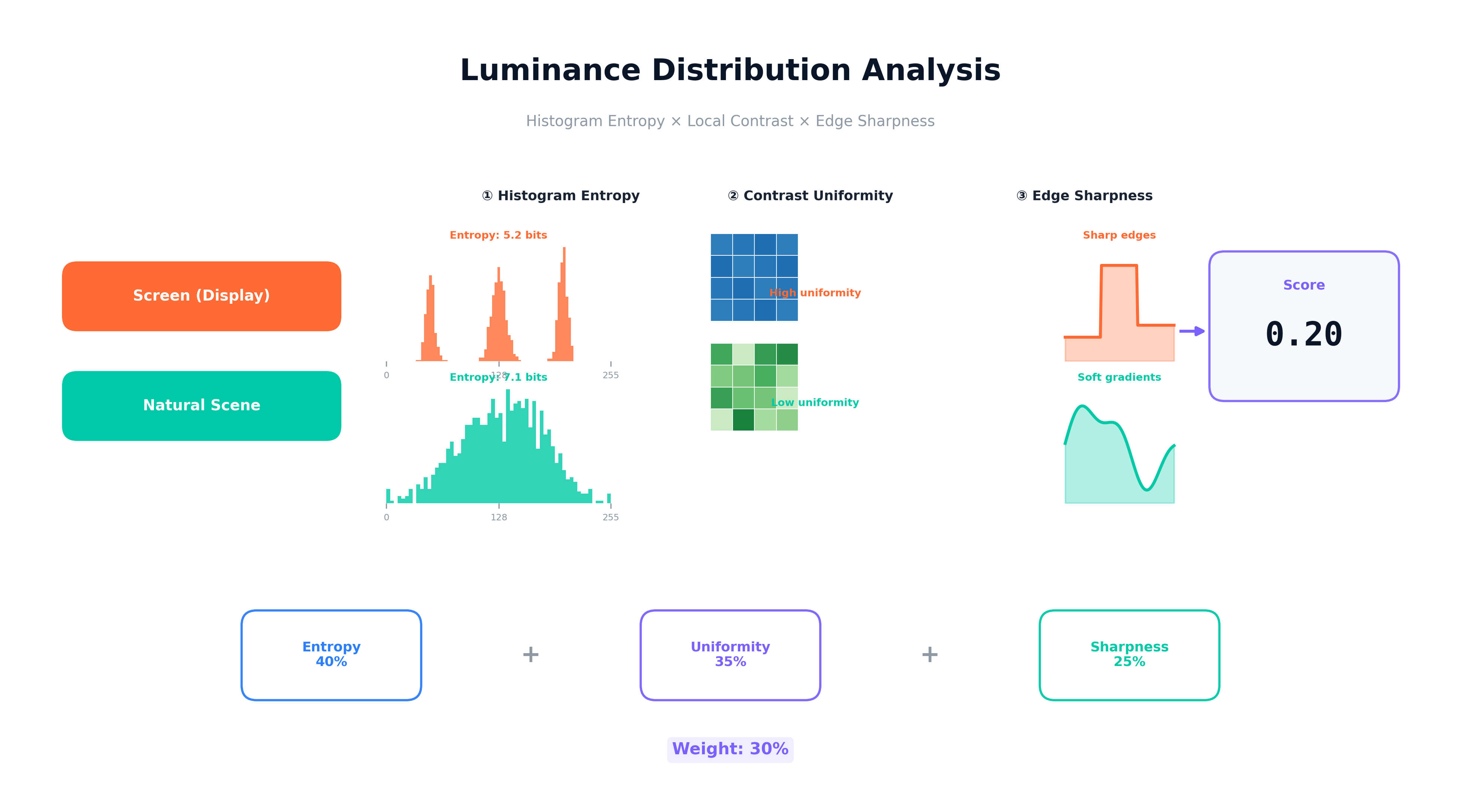 ディスプレイと自然シーンの輝度特性の差異を3つの指標で定量化します。ヒストグラムエントロピー(ディスプレイは量子化された離散レベルのため低エントロピー)、ローカルコントラスト均一性(バックライトの均一性によりディスプレイは高均一性)、エッジシャープネス(ピクセル境界によりディスプレイは鋭いエッジを持つ)の3要素をSobelフィルタベースの勾配解析と合わせて総合判定します。
