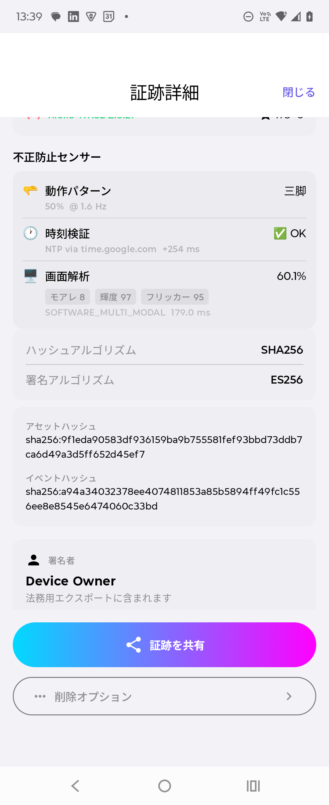 撮影時に以下の3つのデータを自動取得し、CPP準拠のJSONプルーフに埋め込みます。