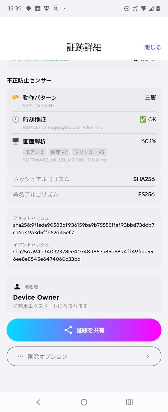 LiDARによるスクリーン検出やXOR完全性検証といった独自技術により、画面の再撮影攻撃や証拠の選択的削除も検知可能です。