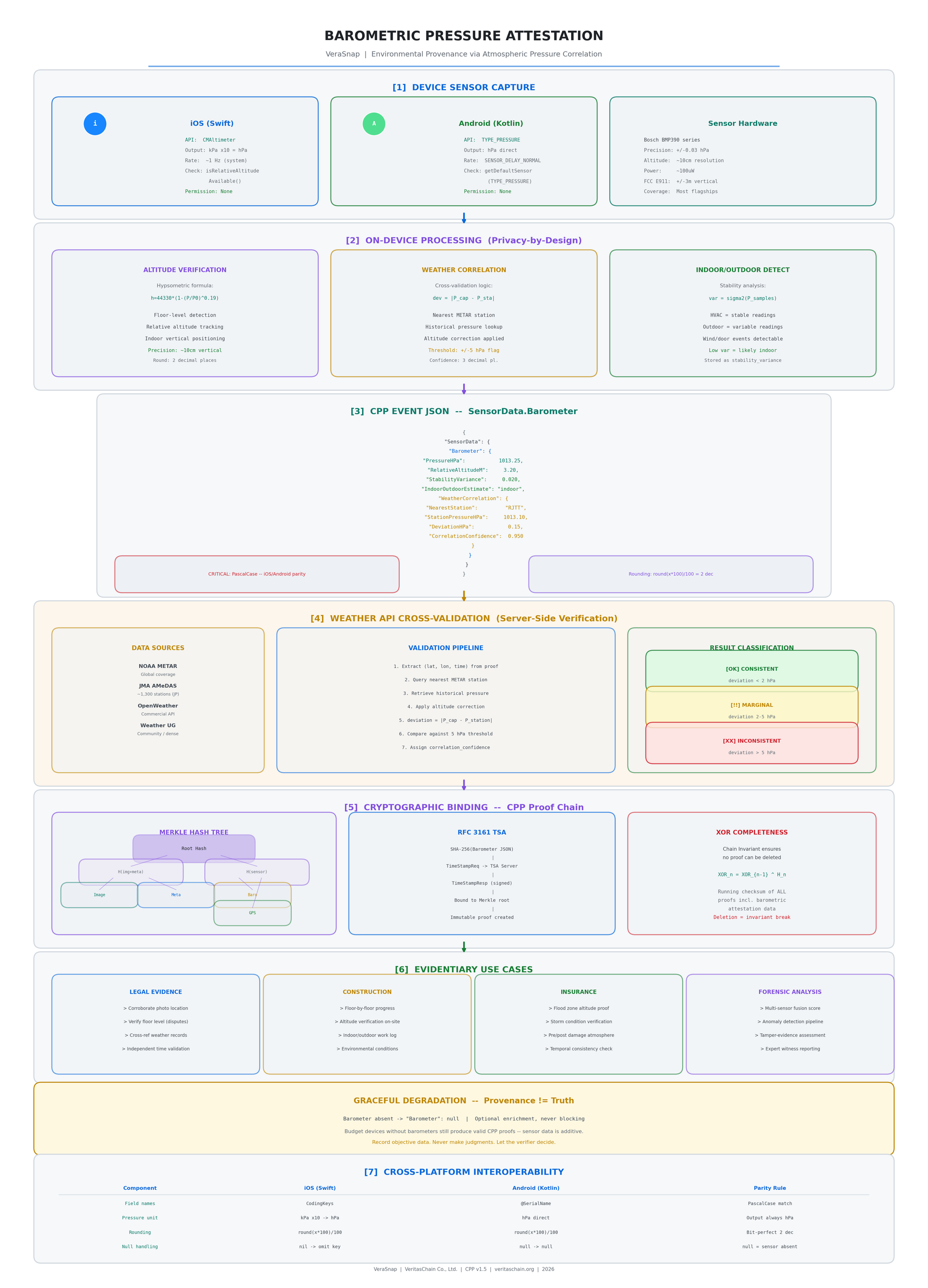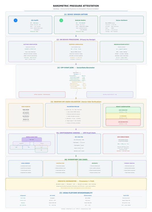 iPhone 6以降に搭載されるBosch BMP390系気圧センサー(精度:±0.03 hPa、高度分解能:約10cm)を活用し、撮影時の環境情報を暗号学的証跡に記録します。