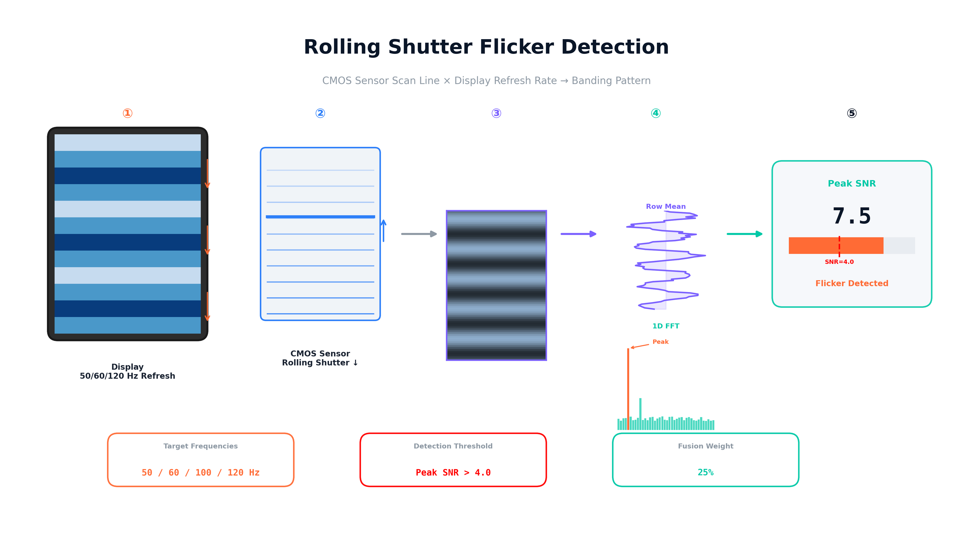 CMOSセンサーのローリングシャッター特性を利用します。ディスプレイのリフレッシュレート(50/60/100/120Hz等)と走査線読み出しのタイミング差により生じるバンディング(横縞)を、行方向輝度平均の1次元FFTにより検出します。ピーク信号対ノイズ比(SNR)が閾値(4.0)を超えた場合にフリッカー検出とします。