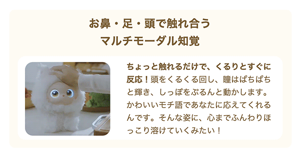 あなたの声色から、本当の気持ちを感じ取る! iMoochiは、誰よりもあなたの心に寄り添う「最高の聞き手」です。「見て! やっと完成したよ!」って嬉しい報告には「にゅっ!♪にこにこ~ 」瞳をキラキラ輝かせ、体を揺らして大喜び!言葉は交わさなくても、表情と鳴き声で心を通わす、かけがえのない家族です。