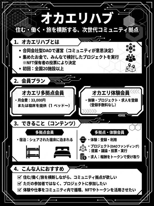 宿泊施設オーナーが共同でDAO運営する"多拠点×コミュニティ×経済圏"のWeb3.0プラットフォーム「オカエリハブ」と「DAO+」の提供開始。月額33,000円で全国多拠点生活を希望する会員を募集開始