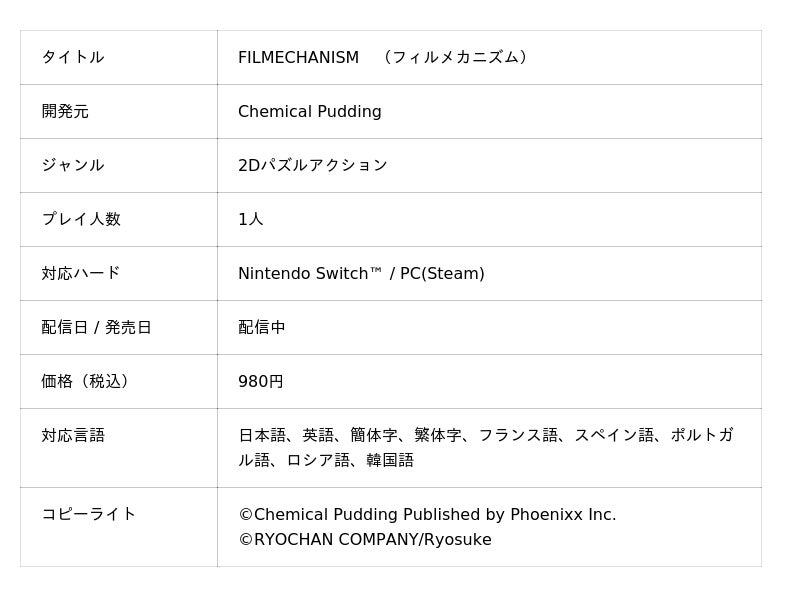 株式会社Phoenixx(フィーニックス)(東京都武蔵野市、代表取締役社長:坂本 和則)は、現在Nintendo Switch(TM)/Steamにて配信中の2Dパズルアクションゲーム『FILMECHANISM』について、本日2月12日(木)より新価格への改定と大型アップデートを配信を行いました。