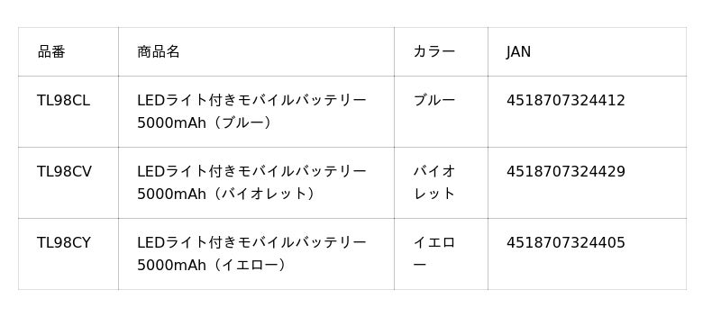 多摩電子工業株式会社(本社:神奈川県川崎市、代表取締役 執行役員社長 杉山一)は、LEDライトを搭載し、日常の外出から非常時まで幅広く活躍する5000mAhモバイルバッテリーを発売します。
