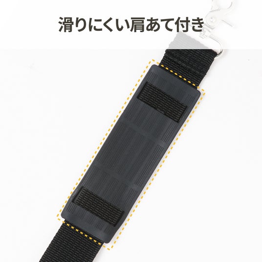 重さを分散して肩への負担を軽減。滑りにくさで移動中のズレを防ぎます。