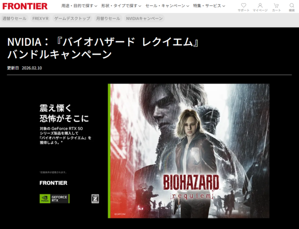 FRONTIERダイレクトストアは、2月10日より「NVIDIA 『バイオハザードレクイエム』バンドルキャンペーン」を開始した。期間中、GeForce RTX 5090、5080、5070 Ti、5070を搭載したデスクトップPCをFRONTIERダイレクトストアで購入すると、『バイオハザード レクイエム』のゲームコードが手に入るバンドルクーポンが進呈されるという。