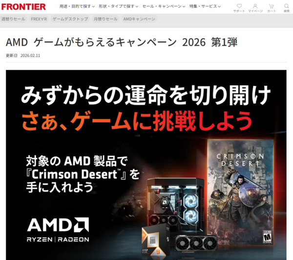 FRONTIERダイレクトストアは、2月11日より魅力的なゲームタイトルが手に入る「AMDゲームがもらえるキャンペーン2026第1弾」をスタートした。このキャンペーン期間中、対象製品購入者は、限定ゲームコード『紅の砂漠』を入手することができる。購入対象期間は2月10日から4月25日までで、エントリーは5月9日まで受け付けている。