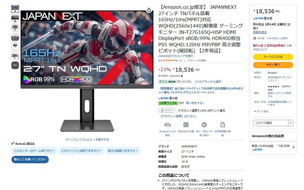 Amazon.co.jpにて、JAPANNEXTの27型WQHDディスプレー「JN-T27G165Q-HSP」が販売中だ。参考価格は2万4073円だが、執筆時点では23%オフの1万8536円で購入できる(2月12日時点)。