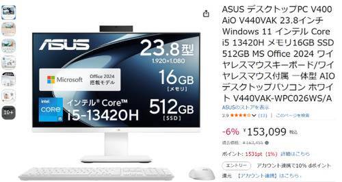 ASUSの23.8型液晶一体型デスクトップPC「V440VAK-WPC026WS/A」がAmazonで割引されています。参考価格163,455円のところ、6%オフの153,099円で販売中です。